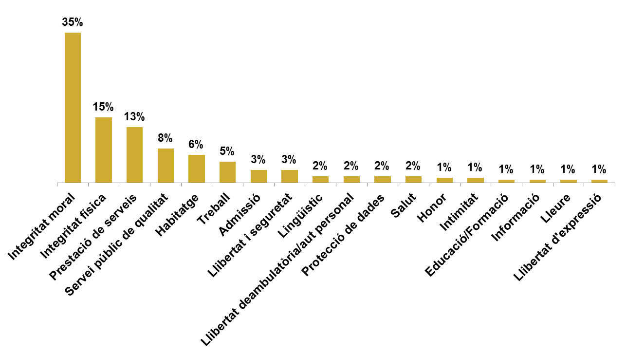 La integritat moral (35%), la integritat física (15%) i la prestació de serveis (13%) han estat els principals drets vulnerats