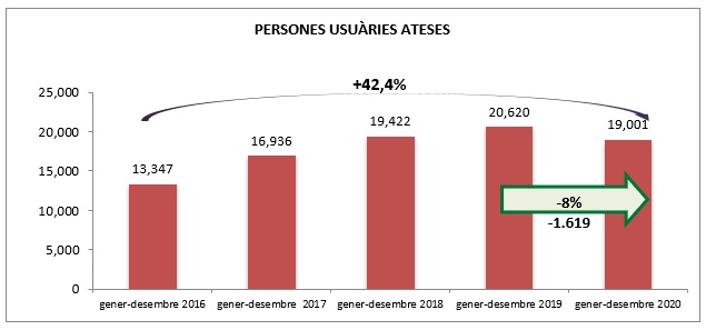 Tot i el descens de persones ateses, l’Ajuntament de Barcelona ha incrementat els esforços per atendre els veïns i les veïnes d’origen migrant, un dels col·lectius que més impacte ha sofert a causa de crisi social i econòmica, que ha pogut agreujar la seva habitual precarietat provocada per la restrictiva legislació d’estrangeria que en dificulta la regularització, l’accés als drets i serveis socials i els aboca a l’economia informal o de subsistència.