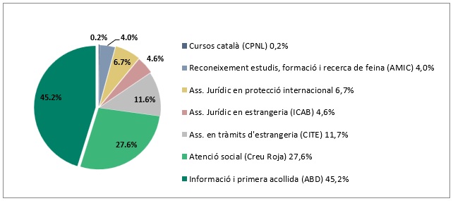 Pel que fa a la tipologia, aquest servei de primera acollida ha estat el tipus d’atenció més freqüent, amb el 45,2% del total, seguida de l’atenció social, amb el 27,6%, dues tipologies d’accions que si bé han baixat lleugerament el seu pes relatiu han incrementat els recursos destinats. D’entre les atencions que han incrementat el seu pes relatiu, cal assenyalar atencions molt específiques com són els assessoraments en tràmits d’estrangeria (del 8,3 a l’11,7%), els jurídics en protecció internacional (del 5,1 al 6,7%) i estrangeria (del 3,7 al 4,6%), així com tot allò relacionat amb l’homologacions d’estudis i relatiu a formació i recerca de feina (del 3,1 al 4%).