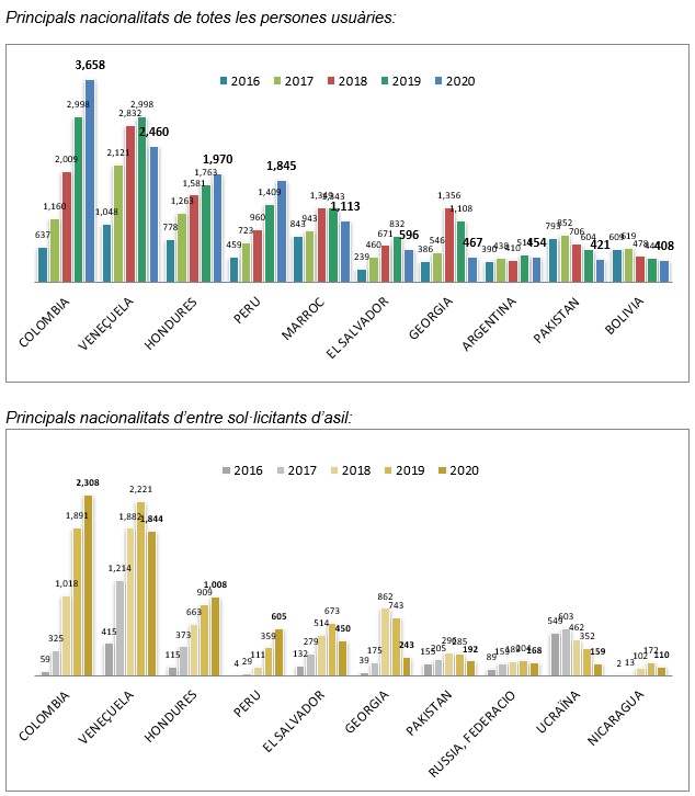 En aquest sentit, després de creixements sostinguts i pronunciats en l’arribada de sol·licitants d’asil provinents de països com Veneçuela, El Salvador o Geòrgia, aquest 2020 han caigut sensiblement l’arribada de persones d’aquestes nacionalitats. Per contra, han crescut les provinents de Colòmbia, la principal nacionalitat en nombre de persones ateses pel SAIER, tant pel que en refugi com en immigració.