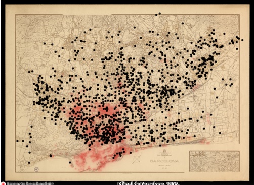 Al plànol s’han marcat, a banda dels refugis, els impactes de les bombes al llarg de la Guerra Civil espanyola.