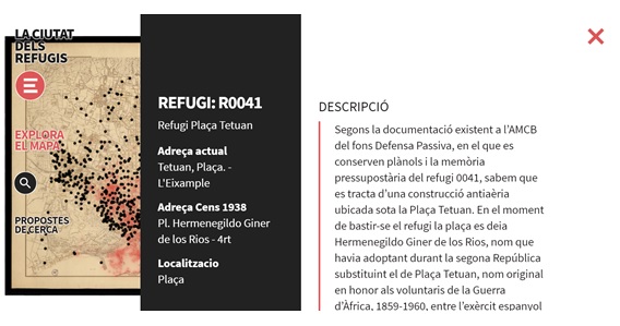 El projecte consisteix en plasmar sobre un site i a través d’un mapa interactiu i accessible tota la informació que tenim sobre els refugis per tal de facilitar la seva consulta. És a dir, fer plausible la dimensió humana i territorial dels bombardejos, traçar sobre el plànol l’esforç de la ciutadania per a protegir-se de la brutalitat i assenyalar les seves cicatrius resultants.