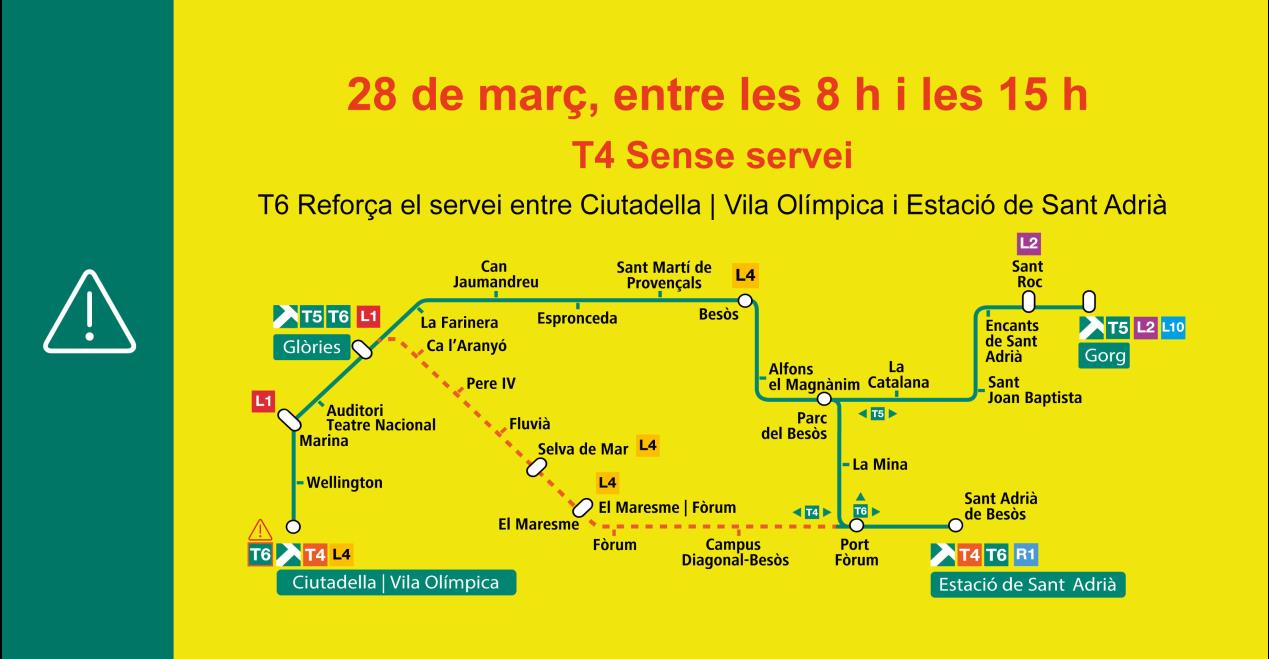 Per aquest motiu, el 28 de març, entre les 8:00 hores i les 15:00 hores s’efectuarà un tall de servei i circulació del tramvia a tota la Línia T4. Durant el tall, la línia T6 reforçarà el seu servei des de Ciutadella | Vila Olímpica fins l’Estació de Sant Adrià. Els horaris de pas de la línia T5 es veuran afectats. Mentre duri el tall i l’afectació al servei es proposen les següents alternatives de transport als usuaris: Bus: 7 – Metro: L4.