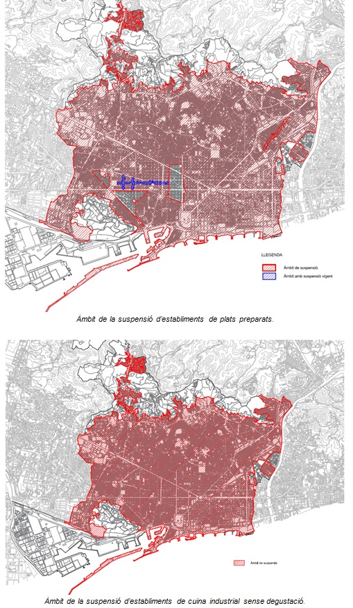 Davant d’aquesta situació, el Govern municipal ha decidit no concedir més permisos vinculats a la instal·lació o ampliació d’establiments amb obrador i/o cuina industrial per a l’elaboració de plats preparats sense venda al públic ni degustació (càtering), ni d’establiments de plats preparats, quan disposin d’obrador. S’ha exclòs de la suspensió l’activitat de càtering quan no sigui una activitat principal sinó complementària d’una altra de les considerades essencials com ara les escoles, hospitals o clíniques, i que es duguin a terme en espais que no estiguin necessàriament situats al costat del propi edifici. L’àmbit de la suspensió afecta tota la ciutat excepte els parcs de Collserola i Montjuïc, les zones industrials de la Verneda i la Zona Franca i els entorns on ja hi ha una regulació específica per a aquestes activitats o una suspensió vigent (la dels futurs eixos verds de la Superilla Barcelona).