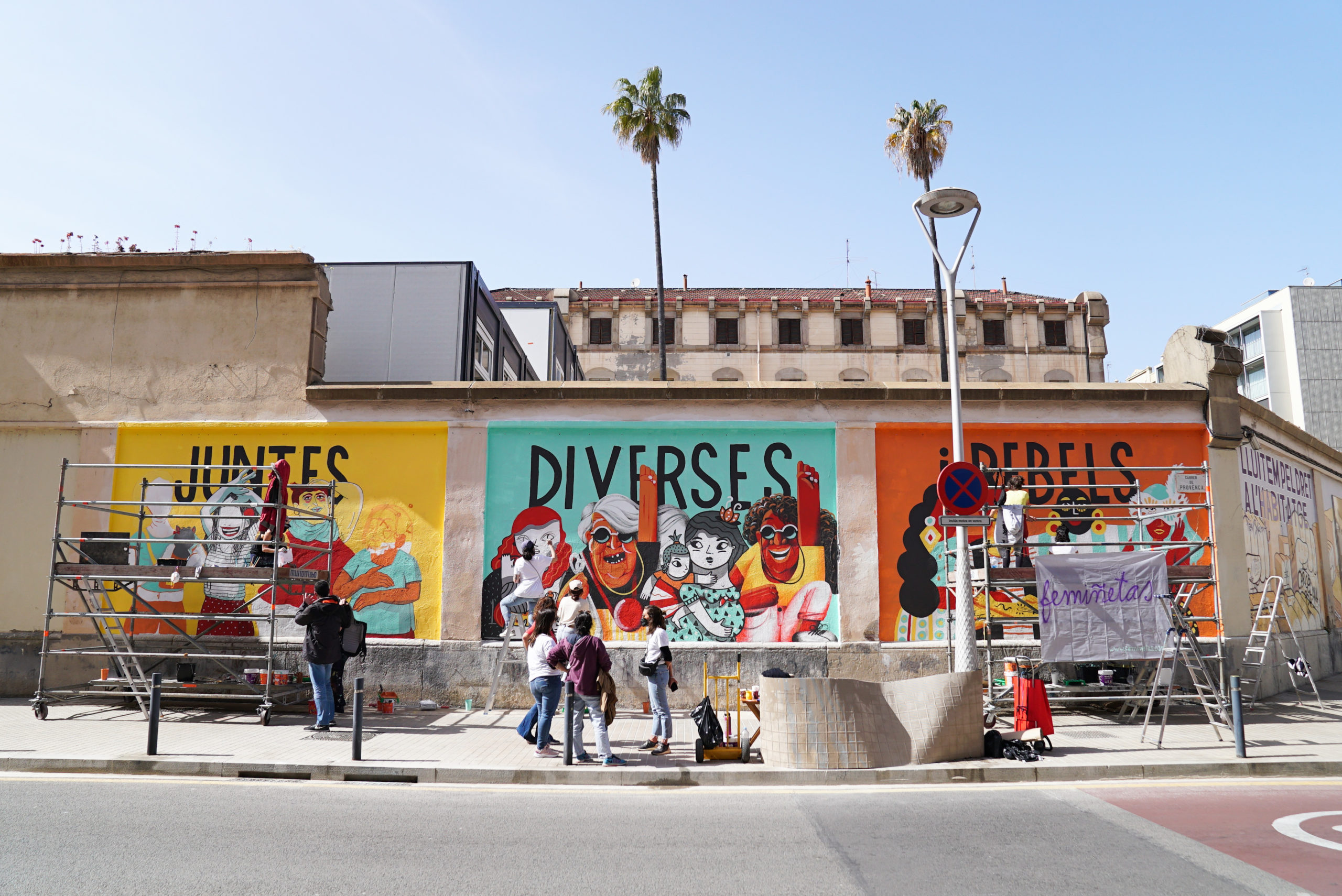 Els murs de l’antiga presó de La Model han estat avui els protagonistes de la creació d’un mural col·lectiu feminista, que sota el lema “Juntes, diverses i rebels”, representa la diversitat de les dones i els diferents papers que tenen a la societat, tot a través de la creació de diversos personatges que tenen en comú la força i el valor de la lluita feminista.