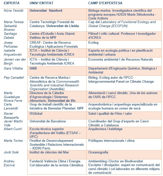 Es tracta d’un grup ampli d’expertes i experts de diferents àmbits de recerca en emergència climàtica: alimentació, comunicació, meteorologia, oceans, verd i biodiversitat, economia i habitatge entre altres, alguns formen part de la reconeguda llista de Reuters de científics de l’àmbit del clima. Per tant es tracta d’un grup multidisciplinari que reforçarà el desplegament de totes les accions de lluita contra el canvi climàtic a la ciutat.