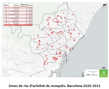 L’Agència de Salut Pública de Barcelona (ASPB) identifica cada any els espais públics de la ciutat amb elements de risc on potencialment pot haver-hi mosquits i on poden representar un problema. Des d’abril a novembre s’intensifica la vigilància en aquests llocs i s’intervé on se’n detecta activitat. El mapa de zones de risc s’elabora a partir de la recollida sistemàtica de dades que fa el Servei de Vigilància i Control de Plagues Urbanes (SVIPLA), provinents de diferents fonts d’informació (inspeccions entomològiques i seguiments de les zones de risc i de les incidències, inspeccions entomològiques dels casos d’arbovirosis o bé revisió de trampes de monitoratge ubicades a la ciutat, entre d’altres). Aquest any s’han ampliat aquestes zones de vigilància, passant de 66 a 81, per reforçar la cobertura en àrees de rendes baixes de la ciutat, tenint en compte les desigualtats en salut.