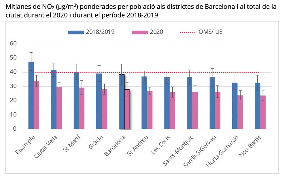 Segons s’exposa a l’informe, la reducció de la contaminació durant el 2020 també es va traduir lògicament en una dràstica reducció dels nivells d’exposició de la població respecte dels nivells habituals (2018-2019). De fet, la concentració mitjana de NO2 a la qual s’exposa la població es va reduir un 28% (11 µg/m3), una circumstància que es va notar especialment al districte de l’Eixample, que va ser la zona de la ciutat que va experimentar una reducció més forta.