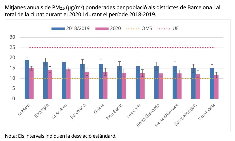 D’altra banda, la concentració mitjana de PM2,5 a la qual s’exposa la població es va reduir un 23% (4 µg/m3) durant el 2020.
