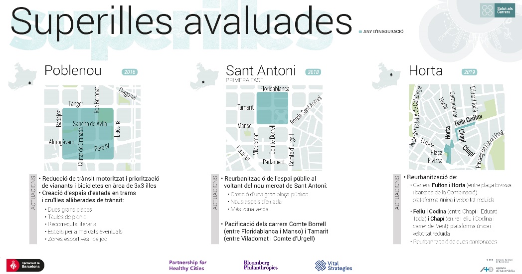 A la Superilla del barri d’Horta l’ASPB ha fet una avaluació quantitativa dels nivells de contaminació i una enquesta de salut que van respondre més de 800 persones abans (primavera 2018) i després (estiu 2020) de la seva posada en marxa. També s’han fet enquestes a peu de carrer per valorar l’ús de l’espai, la contaminació de l’aire i acústica, i el benestar i s’han mesurat els factors que promouen l’activitat física.