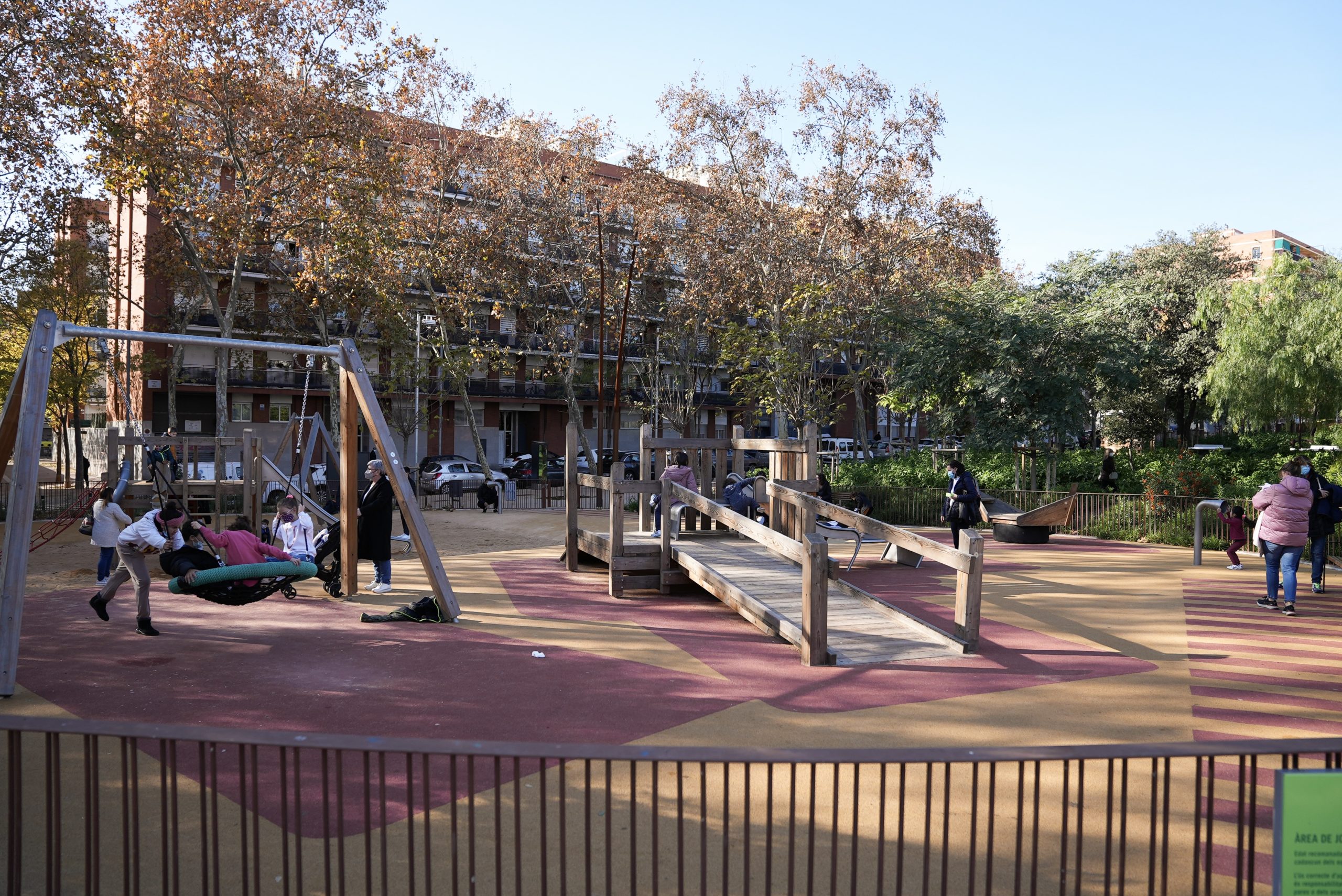 Tot i la seva posició estratègica al barri, a causa de l’edificació que l’envoltava i aïllava del seu entorn, suposava una plaça poc permeable que no participava dels recorreguts cívics del barri. L’interior de la plaça es dividia en tres espais clarament diferenciats: la gran plaça, el llac i el bosc. Tots tres fragmentaven l’espai dificultant la connexió d’activitats entre ells. Amb la nova reurbanització, s’han generat diverses zones d’estada amb nou mobiliari urbà. Aquest espai compta amb una zona de pràctica esportiva amb taules de ping-pong i una paret d’escalada; una àrea d’esbarjo per a gossos de més de 500m2; una àrea de jocs infantils per a totes les edats; un espai polivalent de relació tipus àgora per poder organitzar esdeveniments i actes de petit format; una zona de pícnic; i una zona de fitness amb aparells de gimnàstica per a gent gran.