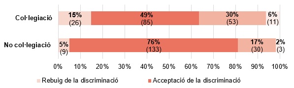 L’estudi “Discriminació a la carta” ha permès detectar diferències substancials entre els comportaments de les agències col·legiades i els de les no col·legiades. Tot i que l’acceptació de la discriminació és majoritària tant entre col·legiats i no col·legiats, en aquests darrers suposen tres de cada quatre agents, una proporció que baixa a lleugerament per sota de la meitat entre els col·legiats. Al mateix temps, signifiquen un nombre més alt els agents que rebutgen tota discriminació entre els col·legiats, un 15%, que no entre els que no ho estan, amb una proporció de tan sols el 5%.