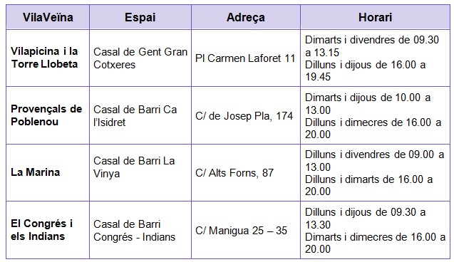 El projecte ‘VilaVeïna. Posant la vida al centre’ engegat per l’Ajuntament de Barcelona dóna servei a 90.000 persones residents en quatre barris de la ciutat des del passat mes d’octubre. La iniciativa, que és el projecte més ambiciós en relació a les cures que s’ha fet mai abans a la ciutat, ja està plenament operatiu als barris de Vilapicina i la Torre Llobeta (Nou Barris), El Congrés i els Indians (Sant Andreu), Provençals del Poblenou (Sant Martí) i La Marina (Sants-Montjuïc). Les adreces i els horaris de les quatre VilaVeïna que ja estan en funcionament són els següents: