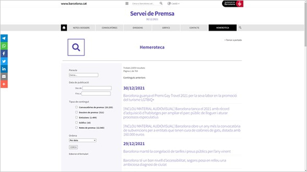 - La nova secció Hemeroteca que permet cercar entre tots els continguts del web per paraula clau, data o tipus de contingut de forma dinàmica