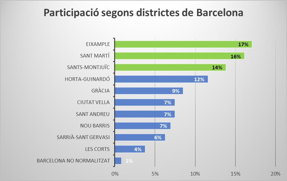 Una anàlisi més específica de la procedència de les persones participants situa en primer lloc al districte de l’Eixample, amb el 17%, seguit de Sant Martí (16%) i Sants-Montjuïc (14%). Els cursos s’han pogut seguir virtualment o en format híbrid, i els exàmens s’han fet presencials a la UAB.