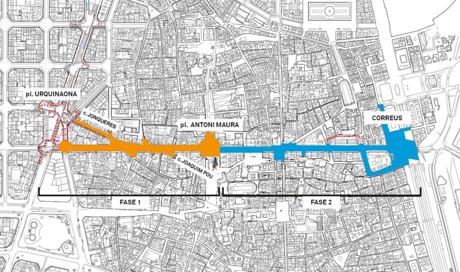 La reforma es farà en dues fases. La primera, que demà comença, es durà a terme en el tram comprès entre la plaça d’Urquinaona i la plaça d’Antoni Maura i tindrà una durada de 14 mesos. Els treballs també inclouran la renovació i millora de les xarxes de serveis existents en el subsòl