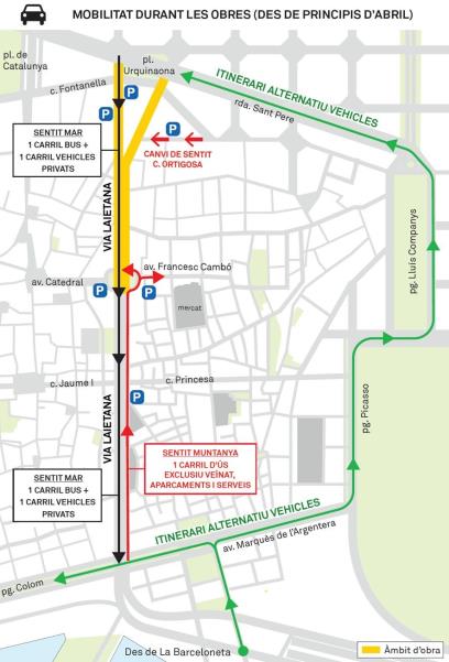 Pel trànsit privat que circuli en sentit ascendent es recomana el següent itinerari alternatiu: avinguda Marquès de l’Argentera, passeig Picasso, passeig Lluís Companys i ronda Sant Pere.