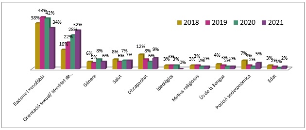 El 2021 s’ha produït un augment molt important respecte els anys anteriors. El 2018 les situacions de LGTBI-fòbia van representar el 16% del total, un percentatge que s’ha doblat aquest 2021, amb el 32% del total d casos. De les 78 situacions (57 al 2020), 50 han estat per homofòbia, 25 per transfòbia i 3 per lesbofòbia. Aquestes situacions marquen una tendència clarament a l’alça on pràcticament igualen les dades de racisme recollides per l’OND i que reflecteixen l’enquistament en les reaccions dels agressors que no volen acceptar la diversitat sexual o la identitat de gènere.