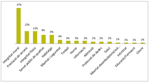 Disminueixen les agressions físiques, del 15% al 13% dels casos, mentre que la vulneració de la integritat moral segueix sent amb diferència el principal dret vulnerat, amb el 37%, i la discriminació en la prestació de serveis es manté amb el 13% del total