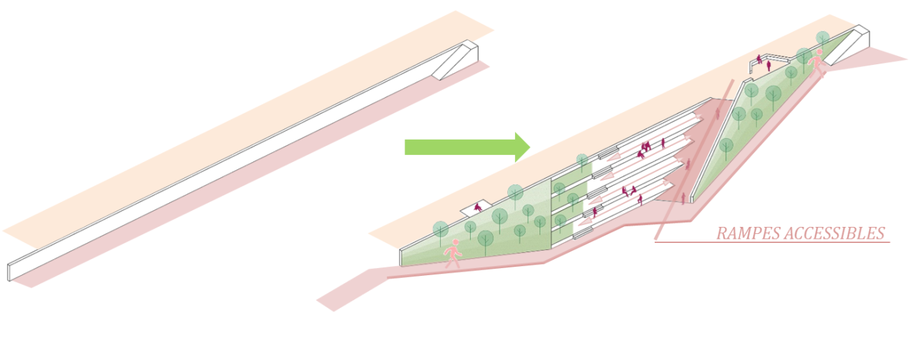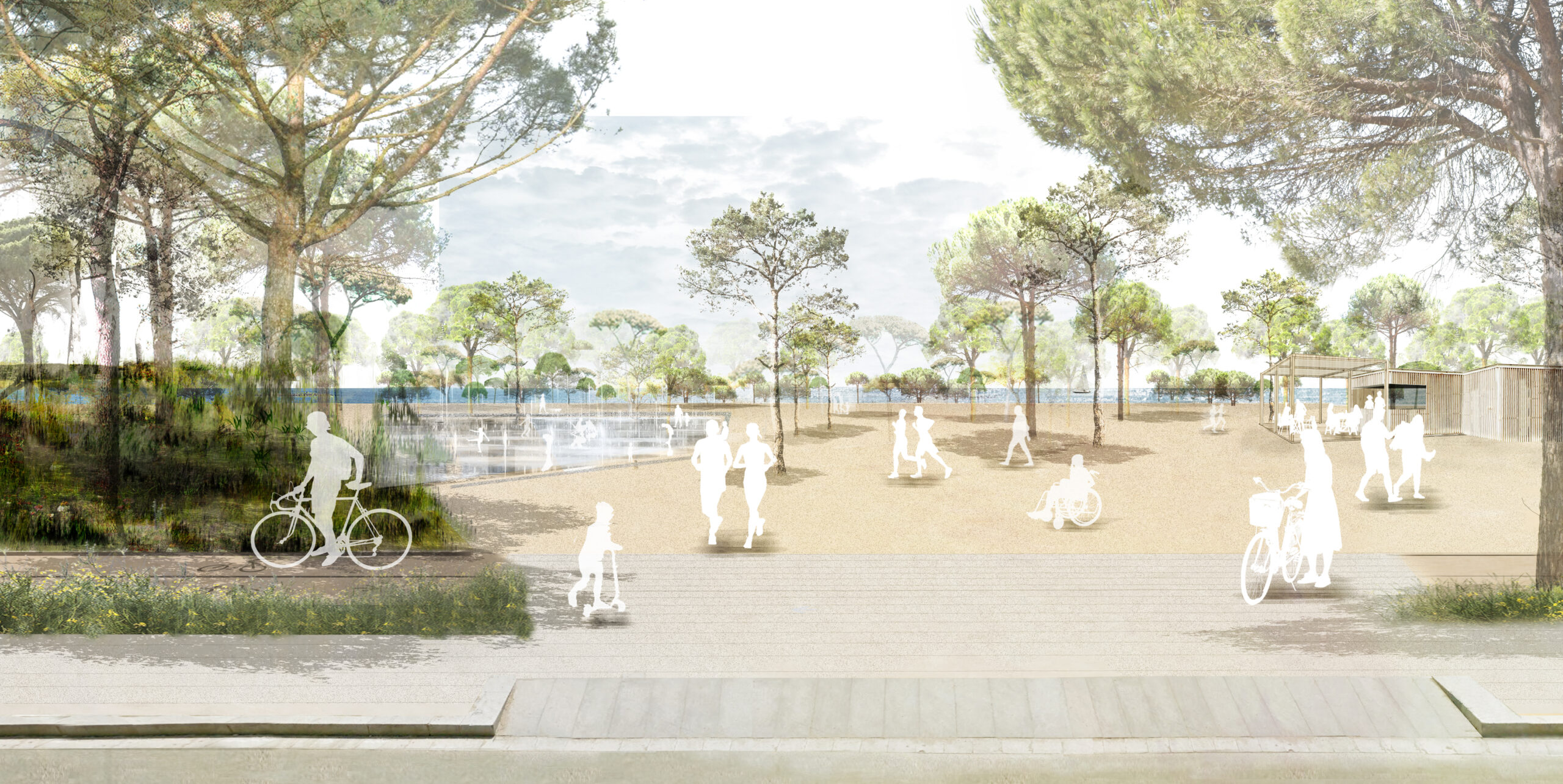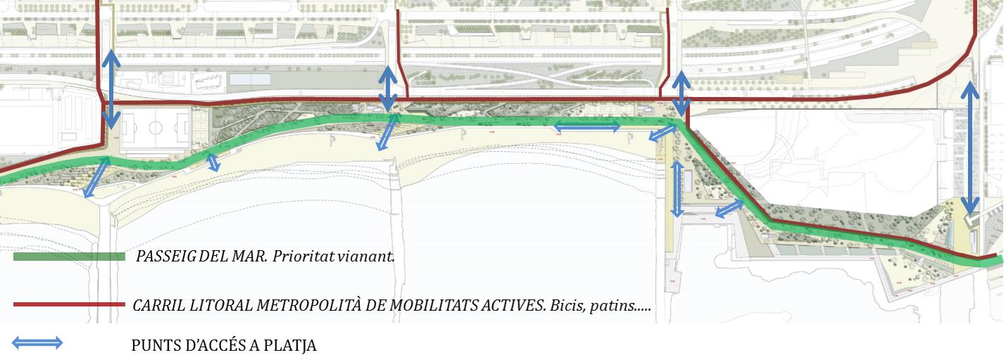 Per millorar l’arribada al mar des dels barris de la zona, la proposta suprimeix els dos nivells que separen la sorra de l’espai de pas i crea baixades àmplies amb rampes accessibles i talussos amb vegetació i llocs per seure