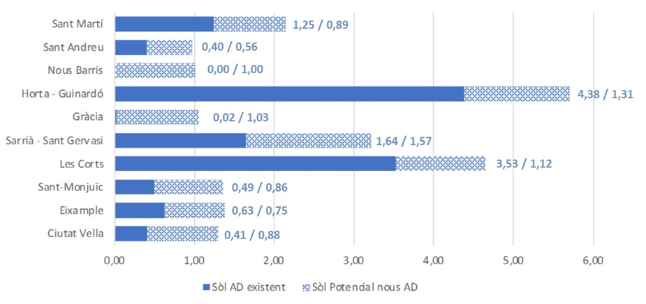 I el creixement pels districtes es distribueix de forma equilibrada per evitar-ne la concentració. El repartiment es calcula a partir de la disponibilitat de sòls d’equipament, la facilitat de transformació, els allotjaments dotacionals existents i el número de persones en situació de vulnerabilitat, i és el següent: