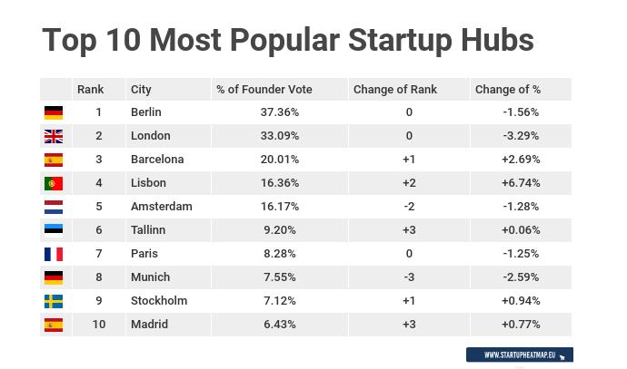 Segons el rànquing Startup Heatmap Barcelona és la tercera ciutat europea preferida pels emprenedors per engegar un nou projecte d’startup. El 20% dels i les fundadores d’aquesta tipologia d’empresa apunten la ciutat com el lloc on podrien imaginar-se començar el seu projecte. Berlin i Londres es troben en primer i segon lloc, i Barcelona puja una posició respecte l’anterior edició. La seva popularitat augmenta en un 2,69% punts, ara, 1 de cada 5 enquestats triaria Barcelona com a seu. Enrere deixa Àmsterdam, que baixa al 5è lloc, i Lisboa, que queda 4a. Madrid es troba en desena posició i València al lloc 17. En termes relatius, són Barcelona i Lisboa, dues ciutats del sud d’Europa, les que guanyen més popularitat entre els i les emprenedores.