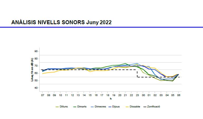 En aquesta gràfica es mostren resultats dels sonòmetres instal·lats al carrer d’Enric Granados durant el mes de juny.