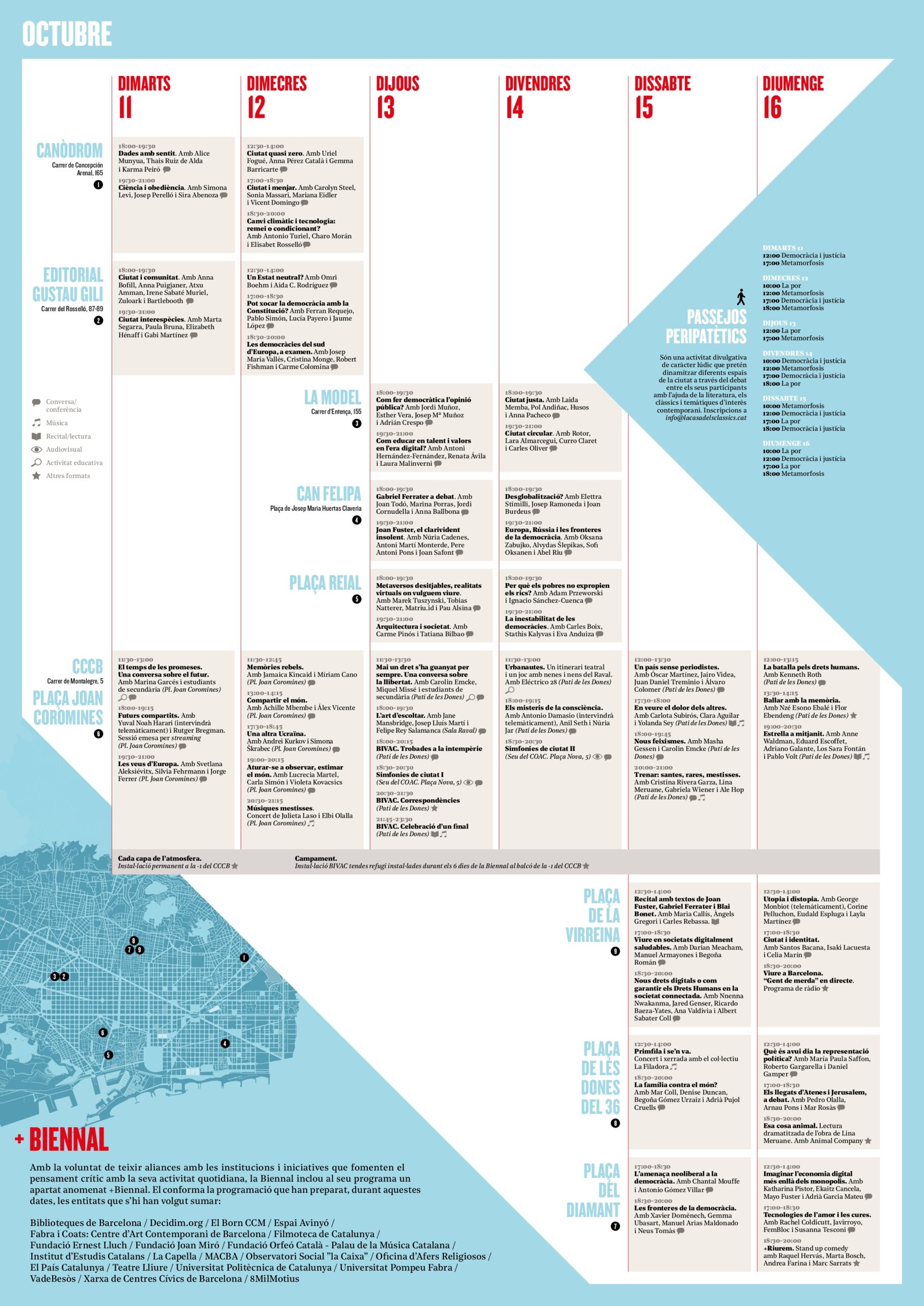 Tant els debats com les activitats divulgatives i artístiques de la Biennal 2022 tindran lloc en diversos llocs de Barcelona, seguint una lògica descentralitzada