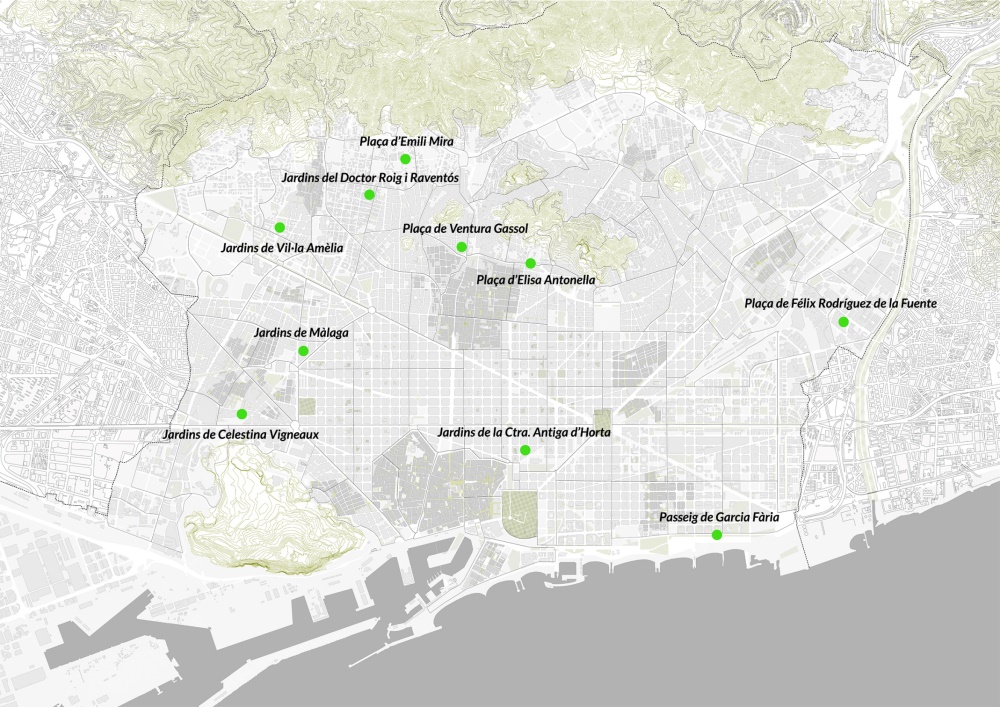 El concurs és una peça clau en aquesta nova visió. La fase de diagnosi i definició dels criteris d’intervenció es va fer conjuntament amb l’Institut Municipal de Persones amb Discapacitat (IMPD), l’Institut Municipal de Parcs i Jardins (IMPJ), l’Institut Infància i Adolescència de Barcelona i la Xarxa d’Accessibilitat i Vida Independent (XAVI). I es van escollir les deu ubicacions següents on dissenyar les àrees, tenint en compte les zones de la ciutat on no existeix cap àrea de jocs totalment accessible ni n’hi ha cap en procés de redacció