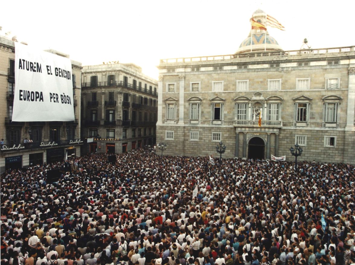 La mostra ressegueix, des de diferents prismes, aquell conflicte al cor d’Europa que va encendre la indignació ciutadana de la Barcelona olímpica: des de les manifestacions als diferents tipus d’ajuts que es van coordinar, com els combois, ajuts als refugiats, debats i la resposta institucional.
