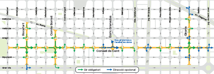 En relació amb el trànsit de pas, el principal canvi es donarà al carrer Consell de Cent que, a partir d’aquesta data, deixarà de ser una via de connectivitat per travessar de punta a punta l’Eixample per transformar-se d’aquí uns mesos en un eix verd on les persones en seran les protagonistes. Amb les modificacions programades es trencarà la continuïtat viària d’aquesta via i per aquest motiu es recomana als conductors buscar itineraris alternatius per creuar aquest àmbit de la ciutat. Girona, Rocafort i Comte Borrell i les noves places també veuran interrompuda la seva continuïtat actual.