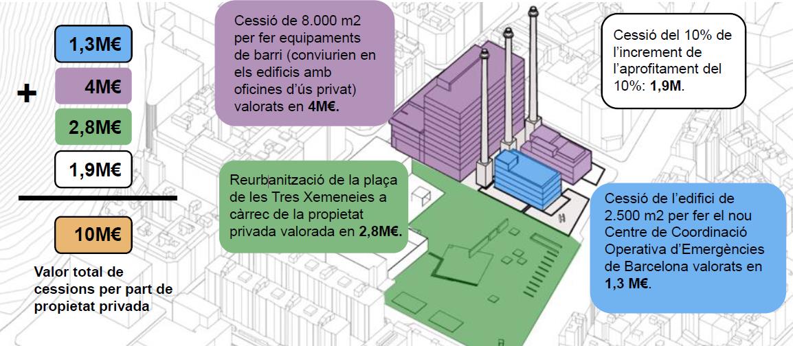 El Govern municipal ha prioritzat des de l’inici del procés que bona part de l’increment de valor repercuteixi en la ciutat i tingui un retorn per als veïns i veïnes en forma d’equipaments de barri i de ciutat i la reurbanització dels Jardins de les Tres Xemeneies. La proposta que planteja ara proposa cessions valorades en 10 milions d’euros, i inclou en l’operació l’edifici d’oficines de Red Eléctrica Española.