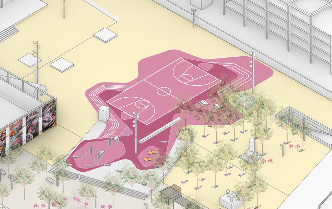 - Una nova pista de basquet com a peça estratègica al centre de la plaça, com una de les principals demandes veïnals. Al seu voltant es redistribuirà l’espai sense generar volums ni barreres. Es garanteix així el trànsit i la polivalència de l’espai davant la programació de festes, concerts i d’altres actes en la plaça.