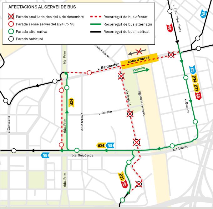 A partir d’aquest diumenge, 4 de desembre, els vehicles que passin per aquesta infraestructura només podran circular en sentit Besòs. Les línies d’autobús 60, B21, B24 i N8 en sentit Llobregat també es veuran afectades