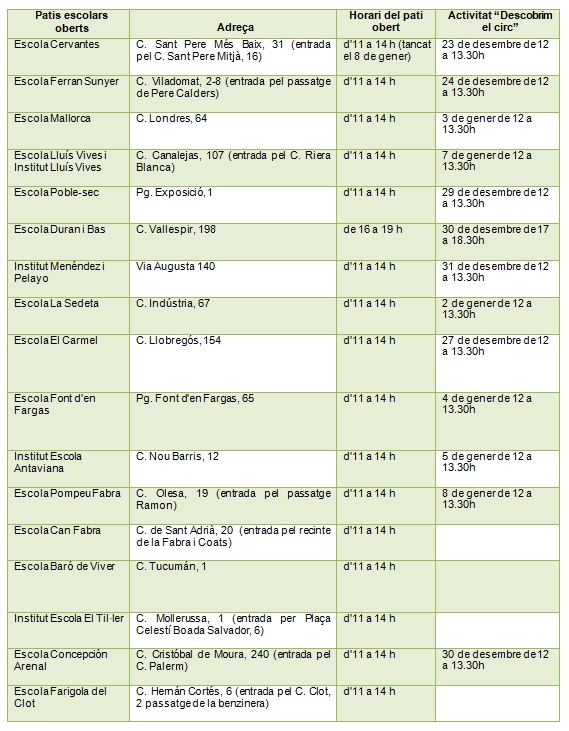 Els patis de 17 escoles de la ciutat restaran oberts fins el 8 de gener, és a dir, tot el període de vacances nadalenques de la mainada, per convertir-se en espais públics dels barris fora de l’horari lectiu. El programa municipal Patis Escolars Oberts és una iniciativa impulsada per l’Ajuntament de Barcelona amb col·laboració del Consorci d’Educació de Barcelona (CEB), els districtes de la ciutat i diverses entitats educatives i socials. La iniciativa busca optimitzar l’ús dels centres escolars per potenciar el vessant educatiu i social d’aquests espais, oferint-los a les famílies, a infants i adolescents per a un ús col·lectiu o per fer-hi activitats, en un entorn segur i de proximitat en horari extraescolar.