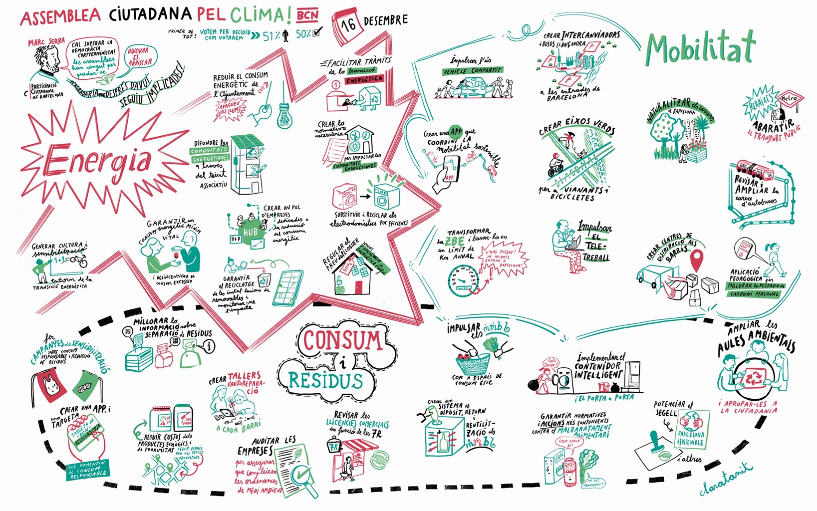 En els tres àmbits de treball les accions que es proposen aposten per accelerar les mesures per combatre l’emergència climàtica. En l’eix de l’energia, les propostes s’encaminen en fer avançar la transició energètica a la ciutat reduint el consum i amb l’aposta per les renovables, les comunitats energètiques i l’eficiència energètica dels edificis. Pel que fa a la mobilitat, les conclusions estan encaminades en seguir transformant la ciutat perquè els mètodes de transport sostenible, transport públic, bicicleta i desplaçaments a peu, siguin l’eix central de la mobilitat a la ciutat. Per últim, pel que fa al canvi de model de consum i gestió de residus hi ha un consens ampli per augmentar les mesures que fomentin el reciclatge i impulsar un model de consum sostenible basat en productes de proximitat i evitant el malbaratament alimentari.