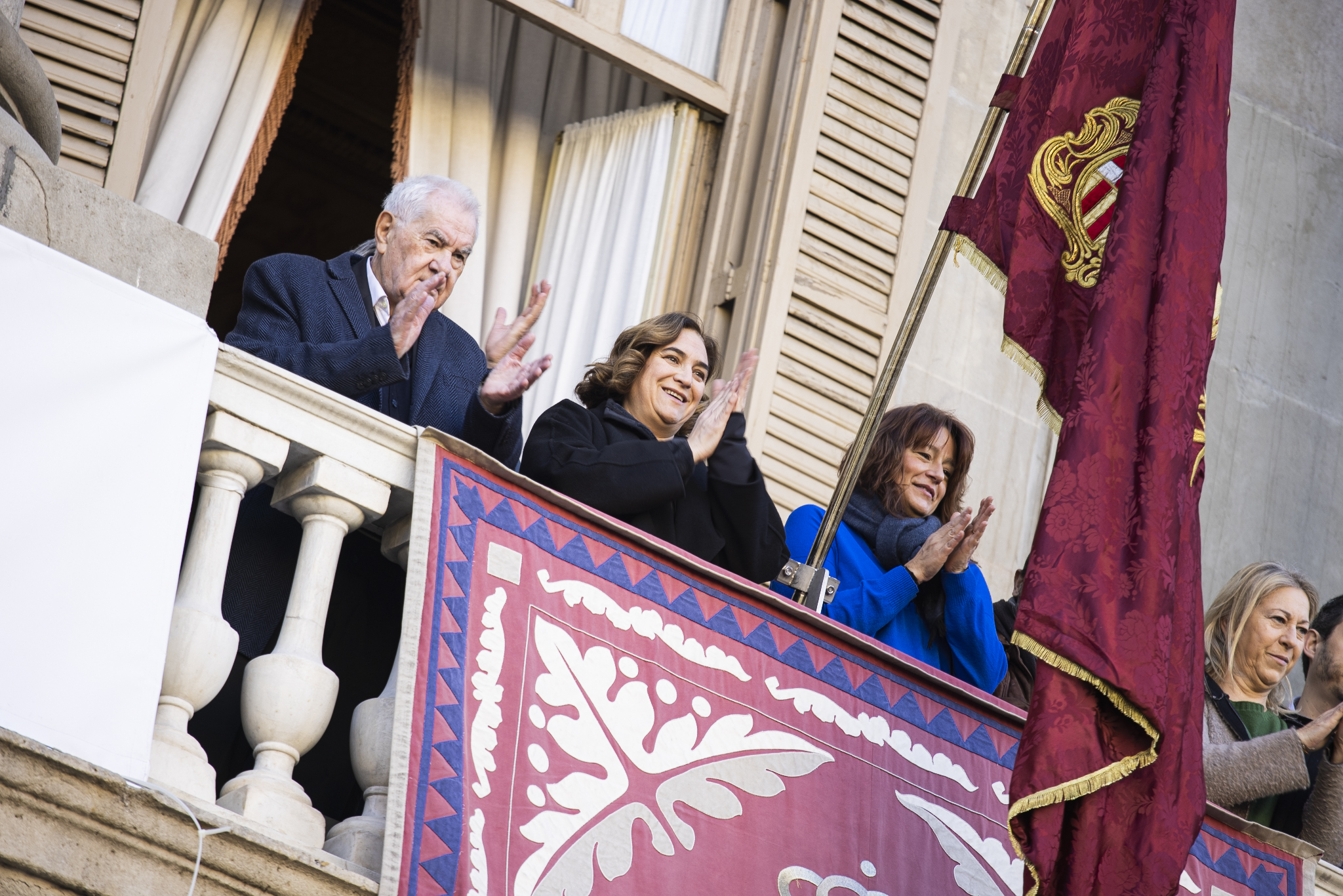 Aquest matí l’alcaldessa de Barcelona, Ada Colau, i altres membres de la Corporació Municipal, han participat en la col·locació del penó de Santa Eulàlia al balcó de l’Ajuntament.