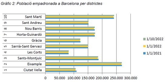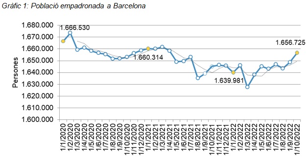 L’evolució de la població empadronada a Barcelona durant els primers deu mesos de 2022 revela dues fases, una d’inicial de descens amb un mínim assolit al març, i una de posterior de recuperació des de llavors, que assoleix el pic a l’octubre del 2022, amb 1.656.725 persones empadronades.