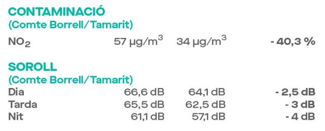 També hi ha hagut millores notables quant a la qualitat de l’aire i al soroll, tal com reflecteixen les mesures preses a la cruïlla entre Borrell i Tamarit. Els nivells de NO2 han disminuït un 40,3%, i la reducció del soroll es produeix durant tot el dia i sobretot en l’horari nocturn, amb 4 decibels menys a la nit. També s’ha detectat una reducció de vora 2 decibels a l’avinguda de Mistral, a l’entorn immediat de la superilla.