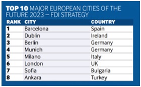 L’informe Ciutats i regions europees del futur 2023/24 (fDI’s European Cities and Regions of the Future 2023/2024- FDI Strategy) considera, un any més, Barcelona com la millor ciutat en promoció i captació d’inversió estrangera d’Europa. La ciutat repeteix el primer lloc en el rànquing que ja va ocupar l’any passat en aquest mateix estudi. Barcelona es troba per davant de ciutats com Dublín, Berlin o Munich i és l’única ciutat espanyola del rànquing.