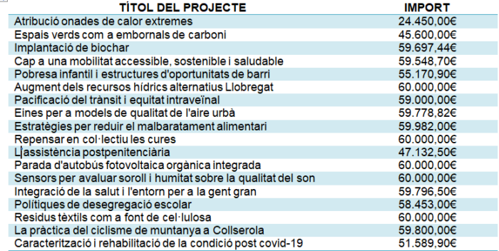 Els 18 projectes que se subvencionen i que es desenvoluparan en els propers 18 mesos són els següents: