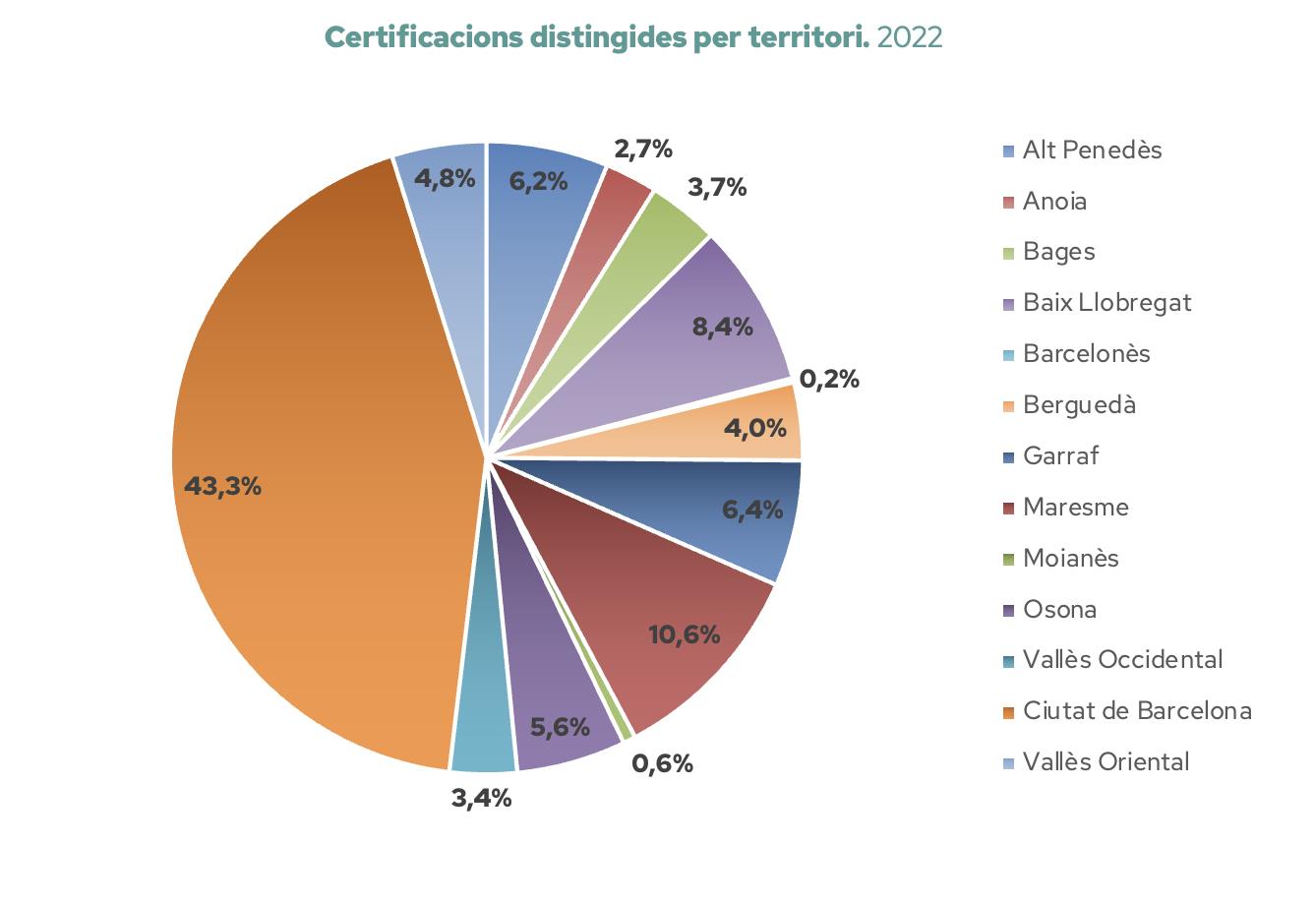 La xifra de certificacions s’enfila fins a les 931 empreses si es tenen en compte el conjunt de comarques de la demarcació de Barcelona. En concret, la ciutat de Barcelona n’ha aportat el 43% del total de certificacions, però comarques com el Maresme i el Baix Llobregat en representen l’11% i el 8%, respectivament.