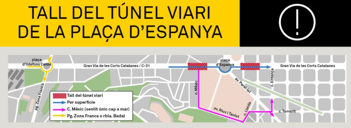 Entre l’1 i el 10 d’abril es tancarà el túnel viari de la Gran Via a la plaça Espanya, en sentit entrada a la ciutat, per treballs previs de les obres