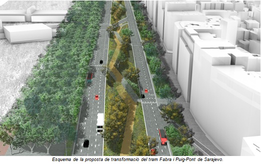 La secció del tram entre el passeig de Santa Coloma i el pont de Sarajevo també guanyarà espai per al vianant. Es crearà una vorera nova, que actualment no existeix, amb una reordenació dels carrils de circulació que es definirà a la redacció de l’avantprojecte.
