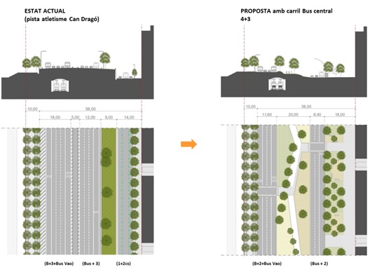 A nivell de mobilitat, els estudis preveuen implantar en sentit entrada un carril bus, dos carrils de circulació i un carril bus VAO; i en sentit sortida, un carril bus i dos carrils de circulació, en el gruix del tram (entre Fabra i Puig i Passeig de Santa Coloma). D’aquesta manera es redueix un carril de circulació per sentit, i a més s’elimina completament la calçada segregada situada a cota de Sant Andreu, a l’altra banda del mur. La intervenció es complementaria amb l’ampliació de la vorera de Sant Andreu, que passaria dels 3,5 als 18 metres.