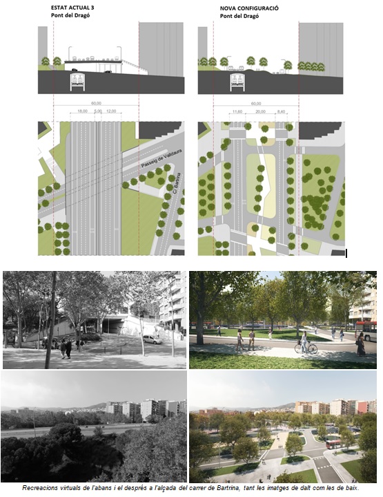 Es planteja recuperar la rasant original de la Meridiana, apropant la cota de Nou Barris i la de Sant Andreu i fent desaparèixer el pont del Dragó; el desnivell se salva amb una mitjana central on s’inclou el carril bici i uns passos de vianant que permeten creuar a banda i banda, recuperant la connectivitat entre barris