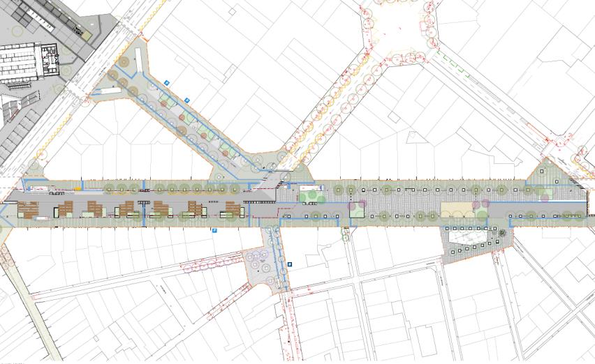 L’asfalt desapareix per donar pas a un paviment de pedra natural, es col·loquen pèrgoles verdes i fotovoltaiques amb zones d’ombra i a tot l’àmbit l’espai destinat als usos ciutadans creix fins als 16.300 m2