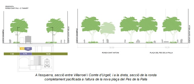 La futura ronda de Sant Antoni es configura com un àmbit pacificat on l’asfalt i la circulació de cotxes desapareixen per donar pas a un paviment continu de pedra natural i de façana a façana. Com a novetat sorgida del recent procés de debat, es configura una nova plaça entre el carrers de Villaroel i Floridablanca completament pacificada i lliure de vehicles –només admetrà el pas necessari de vehicles de serveis i emergència pels laterals–.