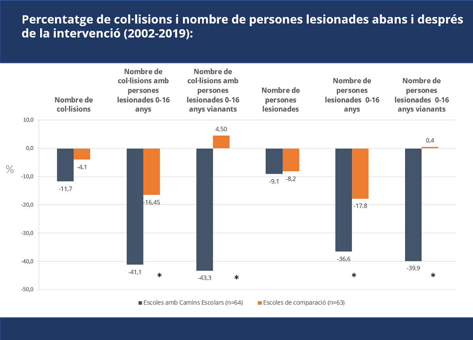 L’Agència de Salut Pública de Barcelona (ASPB) ha avaluat l’efectivitat de la mesura “Camí escolar, espai amic” en la reducció de col·lisions de trànsit i en el nombre de persones lesionades en els entorns escolars. Els resultats conclouen que tant les col·lisions com el nombre de persones ferides es va reduir significativament en els entorns dels centres escolars on s’aplicava la intervenció respecte d’aquells on no s’aplicava, especialment entre els vianants en edat escolar. En concret, es van reduir un 41% les col·lisions de trànsit amb ferits de 0 a 16 anys i un 43% aquelles en què els infants i adolescents lesionats eren vianants. Pel que fa al nombre de vianants de 0 a 16 anys atropellats, la reducció va ser del 40%.