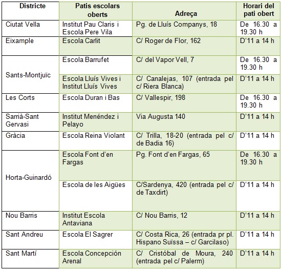 Els patis de 12 escoles de la ciutat s’obriran cada dia des d’avui i fins el 10 d’abril, és a dir, durant tot el període de vacances de Setmana Santa de la mainada. Aquests patis es convertiran així en espais públics dels barris fora de l’horari lectiu. El programa municipal Patis Escolars Oberts és una iniciativa impulsada per l’Ajuntament de Barcelona amb col·laboració del Consorci d’Educació de Barcelona (CEB), els districtes de la ciutat i diverses entitats educatives i socials. La iniciativa busca optimitzar l’ús dels centres escolars per potenciar el vessant educatiu i social d’aquests espais, oferint-los a les famílies, a infants i adolescents per a un ús col·lectiu o per fer-hi activitats, en un entorn segur i de proximitat en horari extraescolar.